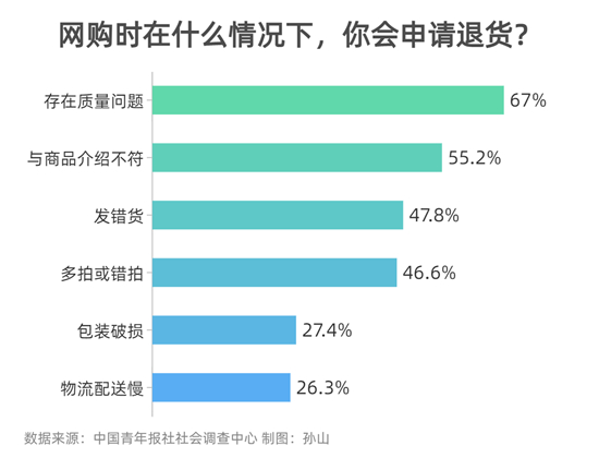 在“3·15國際消費(fèi)者權(quán)益日”到來之際,中國青年報(bào)社社會(huì)調(diào)查中心聯(lián)合問卷網(wǎng)(wenjuan.com),對(duì)1531名受訪者進(jìn)行的一項(xiàng)調(diào)查顯示,存在質(zhì)量問題(67.0%)是受訪者退貨的主要情況,然后是與商品介紹不符(55.2%)。59.4%的受訪者感覺在網(wǎng)購?fù)素浬洗嬖诹鞒谭爆嵉膯栴}。