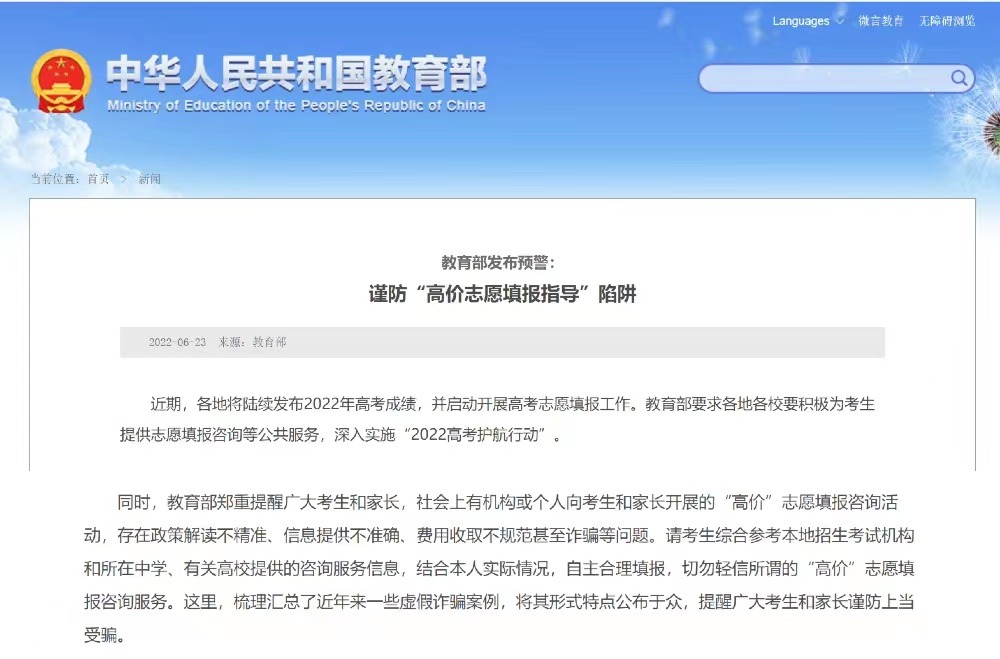 近日,教育部發(fā)布預警,提醒考生謹防“高價志愿填報指導”陷阱。有網站虛假宣傳擁有所謂“內部信息”,自稱掌握內部大數(shù)據,能夠“精準定位院?!钡鹊?。事實上,每年高考填報志愿前,各省級招生考試機構都會發(fā)布當年高考成績統(tǒng)計情況和近年來各高校錄取分數(shù)情況,并不存在市面上的咨詢機構或個人聲稱的“內部信息”。還有一些咨詢機構假冒所謂志愿填報專家身份。該咨詢機構打出廣告,稱團隊的專家“獲得高考志愿規(guī)劃師認證”“來自著名高校”等。事實上,有關部門從未發(fā)放過“高考志愿規(guī)劃師”這類職業(yè)資格證書。該機構一些所謂“志愿規(guī)劃師”都是臨時招募的社會人員,按照總部提供的“臺詞”給考生和家長輔導。家長購買這些機構的服務不僅花了冤枉錢,而且可能報錯志愿。