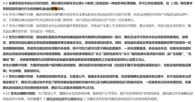 所有網(wǎng)游初次進(jìn)入游戲都會看到一份密密麻麻的游戲服務(wù)協(xié)議,用戶不同意則不能享受游戲內(nèi)容,包括騰訊在內(nèi)運營商為什么都這么做?因為國家規(guī)定。根據(jù)《網(wǎng)絡(luò)安全法》《互聯(lián)網(wǎng)信息服務(wù)管理辦法》《互聯(lián)網(wǎng)用戶賬號信息管理規(guī)定》,互聯(lián)網(wǎng)信息服務(wù)提供者應(yīng)當(dāng)依照法律法規(guī)有關(guān)規(guī)定,制定和公開互聯(lián)網(wǎng)用戶賬號管理規(guī)則、平臺公約,與用戶簽訂服務(wù)協(xié)議,明確賬號信息注冊、使用和管理相關(guān)權(quán)利義務(wù)。玩家使用賬號如果違反法律法規(guī)、用戶協(xié)議的,互聯(lián)網(wǎng)信息服務(wù)提供者有權(quán)采取警示提醒、限期改正、限制賬號功能、暫停使用、關(guān)閉賬號、禁止重新注冊等處置措施。