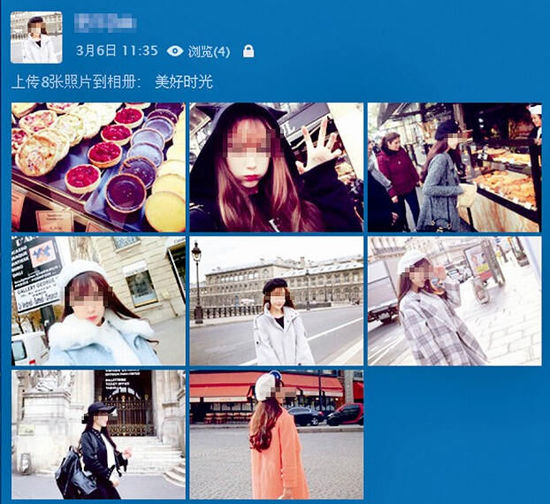 “最好找粉絲在10萬以下的網紅?!痹谖⒉┥希簭妺故斓厮训揭粋€名為“Panny”的模特,點擊其關注的好友,找到類似幾名網紅,讓記者下載她們的照片,用修圖軟件清除圖片上的水印,再上傳到QQ空間。魏強在QQ上假扮的“白富美”網名叫“Eiffel”,他還煞費苦心地更新“Eiffel”的QQ空間。