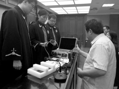 法官當庭檢查齊某提供的理療儀,發(fā)現(xiàn)是三無產(chǎn)品。京華時報記者鄭羽佳攝