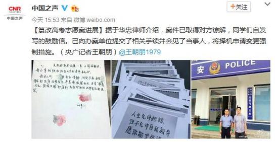 備受關(guān)注的山東青島膠州高三畢業(yè)生常升高考志愿被 同學(xué)郭某某篡改一事有最新進展。案件已取得對方諒解,同學(xué)們自發(fā)寫鼓勵信。已向辦案單位提交了相關(guān)手續(xù)并會見了當(dāng)事人,將擇機申請變更強制措施。(來源:中國之聲)