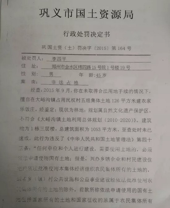 據(jù)記者獲取的材料顯示,2015年12月份,鞏義市國土資源局對李四平進行處罰,案由為“非法占地”。李四平擅自占用集體土地126平方米,建設(shè)農(nóng)家樂,土地性質(zhì)為林地。對其處罰為“自行拆除在非法占用的126平方米土地上新建的建筑物和其他設(shè)施,恢復(fù)土地原狀”“對非法占用的126平方米土地,按每平方米3元處以罰款,共378元?!?/p>
