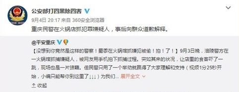 事后,有媒體了解到這名道歉者是來(lái)自重慶市涪陵區(qū)公安局荔枝派出所的一名民警。據(jù)他介紹,當(dāng)時(shí)是正在對(duì)一名長(zhǎng)期吸販毒的犯罪嫌疑人實(shí)施抓捕。由于嫌疑人吸食毒品精神亢奮且隨身攜有刀具,抓捕過(guò)程比較激烈,不少店內(nèi)客人都起身圍觀,有些還拿出手機(jī)拍攝。抓捕結(jié)束后,帶隊(duì)民警第一時(shí)間找來(lái)餐館老板,亮明身份后表示警方會(huì)妥善處理餐館損失,并且特意向店內(nèi)顧客道歉,于是就有了視頻中顯示的畫(huà)面。