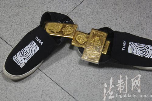 圖為邊防官兵從男子鞋中查出三塊無合法來源的金磚