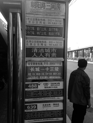 5日,記者來到朝陽區(qū)三間房公交車站,見站牌上除了488路、639路站牌和兩塊公益提示牌外,中間出現(xiàn)了一塊顯示著“公交旅游熱線,長城——十三陵”的牌子,牌子下方還有一排小字,寫著北京一些著名景點的一日游,往返車費50元。記者注意到,不同于其他站牌,這塊公交旅游熱線為不干膠質(zhì)地,表面嶄新干凈,明顯剛粘貼上不久,而正規(guī)公交站牌則是不銹鋼的鋼板。