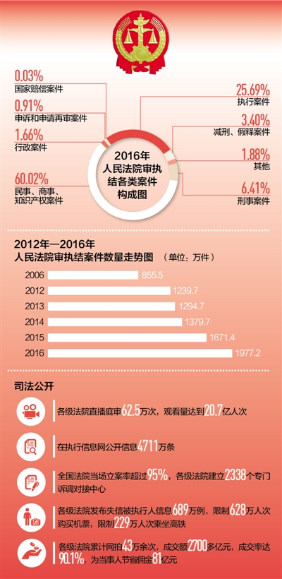 2016年,各級法院向執(zhí)行難全面宣戰(zhàn),共受理執(zhí)行案件614.9萬件,執(zhí)結(jié)507.9萬件,同比分別上升31.6%和33.1%,執(zhí)行到位金額1.5萬億元,同比上升54%。與公安部等10多個部門建立網(wǎng)絡(luò)執(zhí)行查控系統(tǒng),執(zhí)行法官足不出戶即可依法查詢被執(zhí)行人財產(chǎn)和相關(guān)信息,實現(xiàn)了執(zhí)行模式的根本變革。發(fā)布失信被執(zhí)行人信息689萬例,限制628萬人次購買機票,限制229萬人次乘坐高鐵。依法懲治拒不執(zhí)行裁判行為,司法拘留1.6萬人,追究刑事責任2167人,讓司法裁判真正成為懲治違法失信的利劍。