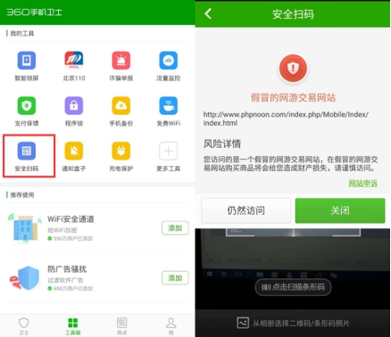 第五,使用360手機(jī)衛(wèi)士等安全管理軟件,通過安全掃碼功能掃描二維碼,識(shí)別釣魚網(wǎng)站以及手機(jī)木馬,保護(hù)手機(jī)安全不中招。