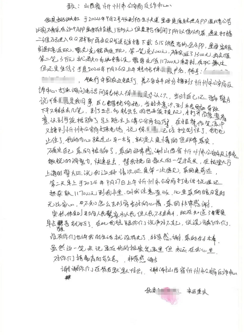 2024年9月26日上午10時(shí)許,忻州市公安局反詐中心接到銀行工作人員反映:有一名男子正在中國(guó)農(nóng)業(yè)銀行七一民心支行進(jìn)行可疑大額取現(xiàn)操作。反詐中心民警立即到達(dá)現(xiàn)場(chǎng),找到已經(jīng)取完款的男子徐某。經(jīng)詢問(wèn),民警得知徐某系受網(wǎng)上陌生人指使進(jìn)行取款,并在取款后將款項(xiàng)轉(zhuǎn)交他人以獲利。隨后,經(jīng)民警進(jìn)一步調(diào)查發(fā)現(xiàn),徐某當(dāng)時(shí)取出的11.7萬(wàn)元現(xiàn)金系上海市一受害者的被騙資金。民警當(dāng)即將徐某進(jìn)行控制,并在現(xiàn)場(chǎng)周邊排查其他可疑人員,將負(fù)責(zé)監(jiān)督徐某取款的一名河南籍男子抓獲。 通過(guò)市公安局、忻州農(nóng)行警銀高效聯(lián)動(dòng),成功為上海籍受害人挽回?fù)p失11.7萬(wàn)元,依法對(duì)2名違法行為人進(jìn)行行政處罰。 10月9日,忻州市公安局反詐中心收到了受害人親筆寫(xiě)下的感謝信,信中表達(dá)了對(duì)忻州反詐民警真誠(chéng)而濃厚的謝意。
