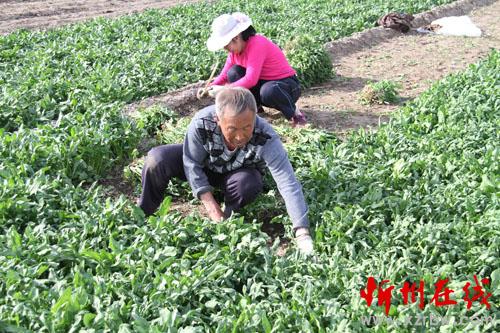 4月7日,原平市南灘村綠油油的菜地里,一對夫妻正在揮鐮收菠菜,準備銷往市場。該市在落實各項惠農政策的同時,積極推進農業(yè)結構調整,將簡單粗放型農業(yè)向精細高效型農業(yè)提升,使農民收入成倍翻番,真正讓農民嘗到了甜口。(褚震 攝)