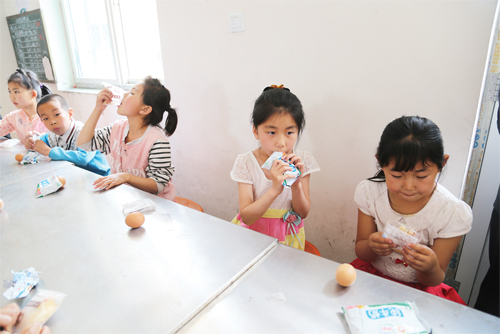 6 月23 日,靜樂縣中莊鄉(xiāng)中莊村小學(xué)學(xué)生正在吃領(lǐng)到的“營(yíng)養(yǎng)餐”。截至目前,該縣共有4所初中、32 所小學(xué)、40 個(gè)教學(xué)點(diǎn)的2391 名中小學(xué)生每天均可享受到農(nóng)村義務(wù)教育“營(yíng)養(yǎng)餐”所帶來的溫暖。(閆曉梅 攝)