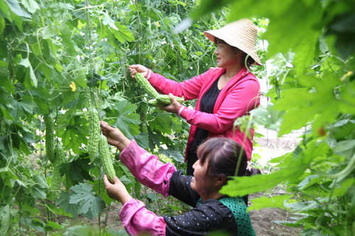 7月16日,原平市新原鄉(xiāng)解放街村菜農(nóng)管仲衛(wèi)蔬菜種植基地,員工們正在采摘長勢喜人的苦瓜,老管種植蔬菜已有30多個年頭,近年來他每年種植和育苗六個系列40多個品種蔬菜,成為了遠近聞名的種植大戶和種植能手,并且成為當?shù)厥卟朔N植的帶頭人,有效地促進了增產(chǎn)增收共同致富,鼓起了他們的錢袋子。(趙春曉 攝)