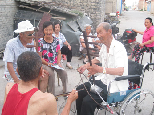 7月31日,河曲縣北元村一處街頭巷口傳出陣陣音樂和“山曲兒”聲。愛好文藝的氣象局退休人員段王鎖和村民經(jīng)常相聚街頭巷口,吹的吹,拉的拉,唱的唱,每每吸引鄉(xiāng)親們前來共享“農(nóng)家樂”。既起到了陶情怡性的作用,也給鄉(xiāng)親們帶來具有鄉(xiāng)土風(fēng)味的精神食糧。(賈金理 攝)