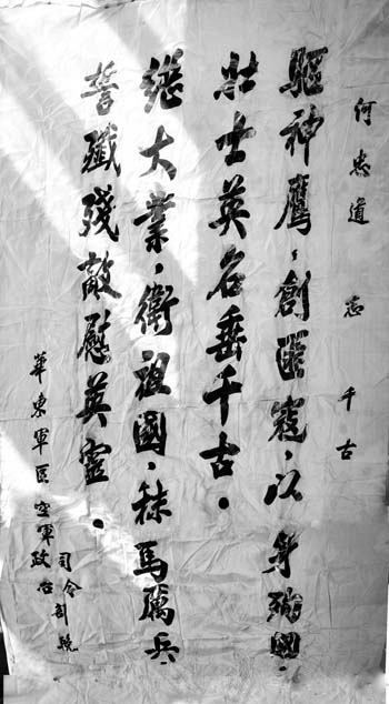 何忠道的犧牲,引起了整個空軍系統(tǒng)的震憾,人民空軍舉行了隆重的追悼大會??哲姍C(jī)關(guān)、華東軍區(qū)、生前所在部隊機(jī)關(guān)、戰(zhàn)友送了幾十幀挽幛??哲娝玖顔T劉亞樓、副司令員常乾坤、副政委吳法憲、參謀長王秉璋聯(lián)名敬獻(xiàn)的挽幛上書:“殲滅美國侵略者,堅決保衛(wèi)祖國領(lǐng)空,為何忠道同志復(fù)仇!”華東軍區(qū)司令部、政治部敬獻(xiàn)的挽幛上書:“驅(qū)神鷹,創(chuàng)飛寇,以身殉國,壯士英名垂千古。創(chuàng)大業(yè),衛(wèi)祖國,秣馬厲兵,誓殲殘敵慰英靈?!?/p>