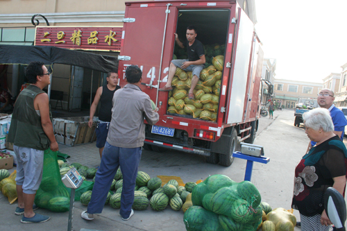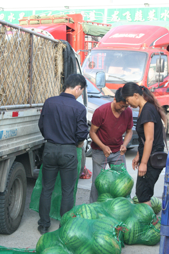 暑期天氣赤日炎炎,8月7日,原平市德金集貿(mào)瓜果蔬菜市場大西瓜貨豐價(jià)穩(wěn)購銷兩旺,市民們紛紛購買防暑解熱。(趙春曉 攝)