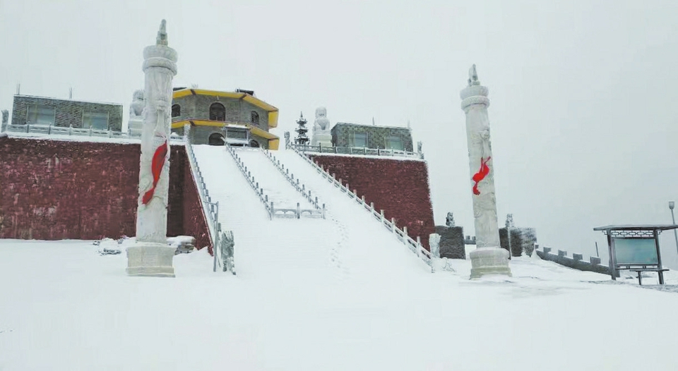 此次降雪主要分布在五臺(tái)山平均海拔2800米以上的五座臺(tái)頂。因?yàn)榕_(tái)頂與臺(tái)懷腹地海拔相差1000米以上,所以時(shí)有“臺(tái)懷飄雨臺(tái)頂雪”的奇觀出現(xiàn)。東臺(tái)頂亦名望海峰,《清涼山志》載:“蒸云寢壑,爽氣澄秋,東望明霞,若陂若境,即大海也。亦見滄瀛諸州,因以為名?!蓖7迨俏迮_(tái)山觀日出的絕佳位置。7日一大早,東方不見明霞,整個(gè)東臺(tái)頂銀裝素裹,霧靄茫茫,天籟梵音依舊,在圣潔的佛國仙境踏雪而行,更深切地感受人生一步一個(gè)腳印的意義。(本報(bào)記者 馬卓超 通訊員 覺一 攝影報(bào)道)