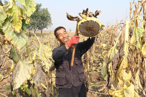 10月13日,原平市解村鄉(xiāng)圪坨村林同種植專(zhuān)業(yè)合作社正在收獲向日葵,該社引進(jìn)三瑞公司種植1000余畝SH363向日葵喜獲豐收。近年來(lái),該市積極引導(dǎo)農(nóng)民調(diào)整農(nóng)業(yè)產(chǎn)業(yè)結(jié)構(gòu),采取“合作社+農(nóng)戶(hù)”的模式,向日葵比玉米收入高四倍,銷(xiāo)售價(jià)每斤4塊左右,合作社為農(nóng)戶(hù)提供種子、種植技術(shù)等服務(wù),帶動(dòng)當(dāng)?shù)厝罕娫鍪罩赂弧?span style="font-family: 楷體,楷體_gb2312, simkai">圖為解村鄉(xiāng)村民趁著秋高氣爽的晴好天氣,在田間地頭葵花籽的情景。(褚震 攝)
