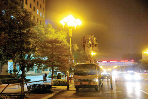 路燈檢修工人穿好工作服,戴上安全帽,登上搶修車的工作臺(tái),對(duì)路燈、接線箱、燈桿等照明設(shè)施進(jìn)行了全面細(xì)致的檢查、維護(hù)、更換。10月26日9時(shí)許,記者在我市城區(qū)長(zhǎng)征路上看到,市政公司組織工人冒著凜冽的寒風(fēng),正在對(duì)道路兩旁損壞的路燈進(jìn)行更換,確保夜幕下城區(qū)的每一盞路燈都能夠正常照明。圖為工人師傅正在長(zhǎng)征路上對(duì)損壞的路燈進(jìn)行更換。(張志遠(yuǎn) 王菲 攝)