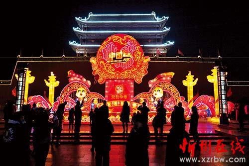 距離元宵節(jié)還有幾天時(shí)間,但忻州城區(qū)北城門樓的南北廣場(chǎng)上已展開吉祥喜慶的“中國夢(mèng)”與“錢袋子”大型燈展,吸引眾多市民前來觀賞。(魯明強(qiáng) 攝)