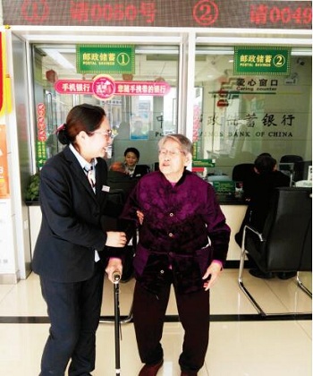 城區(qū)利民街西口郵政儲蓄銀行員工熱情為客戶服務,受到群眾好評。圖為該行客服經(jīng)理微笑攙扶、護送八旬老客戶辦理完業(yè)務后離開大廳。
