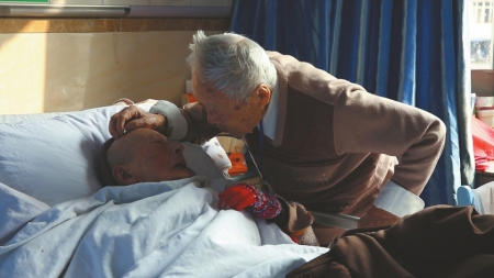下午三點半,成都一家醫(yī)院住院部里有點安靜,醫(yī)院大多是老年人,吃了午飯后都在午休。電梯的門開了,一位老人兩鬢斑白,身體有些彎曲,拄著拐杖挪著小碎步。他走得很慢,他要走從電梯口走完整個走廊,到盡頭的那間病房去。走廊的昏暗,拉長了老人的身影。隨著拐杖聲的臨近,他走進(jìn)了病房,眼神突然也亮了起來。