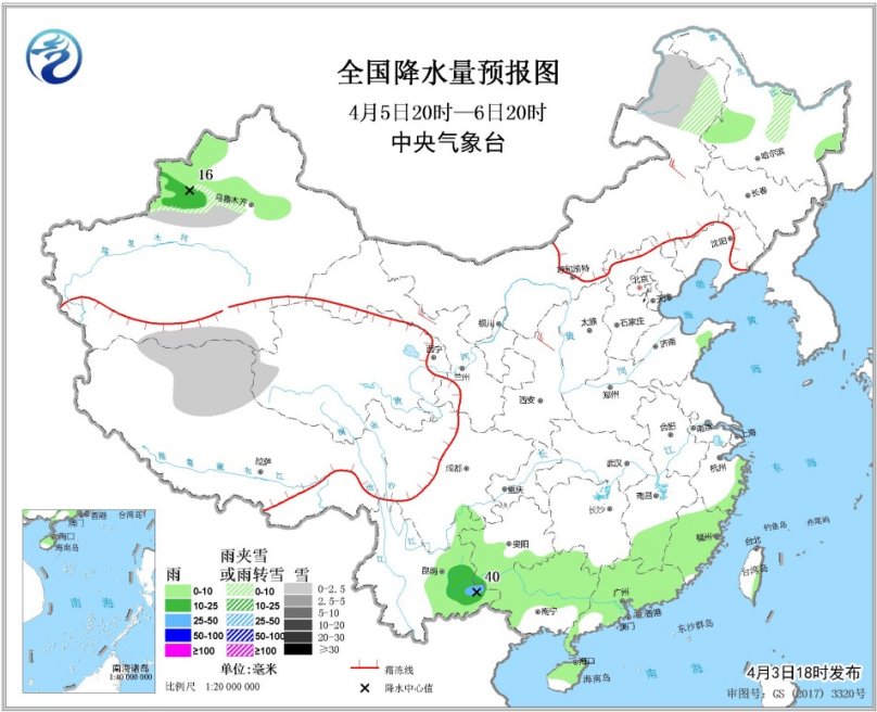 4月5日20時至6日20時,內(nèi)蒙古東北部、新疆天山西部、西藏北部等地的部分地區(qū)有小雪或雨夾雪。新疆伊犁河谷和天山地區(qū)北部、江南東南部、華南、云南東部、貴州西部和南部等地有小雨,其中,新疆伊犁河谷、云南東南部等地部分地區(qū)有中雨,局地大雨。西北地區(qū)中東部、華北北部等地的部分地區(qū)有4~6級風。