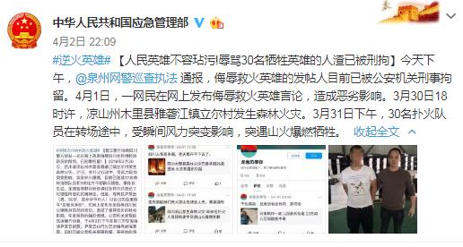 4月2日晚十時許,中華人民共和國應急管理部通報了該事件,并稱“人民英雄不容玷污!辱罵30名犧牲英雄的人渣已被刑拘”。