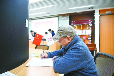 4月3日,中華遺囑庫(kù)第二登記中心揭牌成立,前來(lái)體驗(yàn)遺囑辦理程序的老人蔡先生正在填寫相關(guān)登記表。(記者 和冠欣 攝)