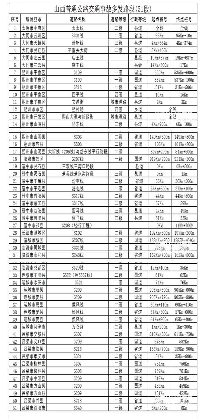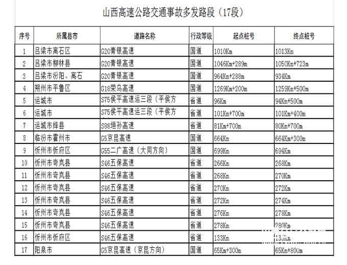 | 注意!山西公布68處道路交通事故多發(fā)點段 |