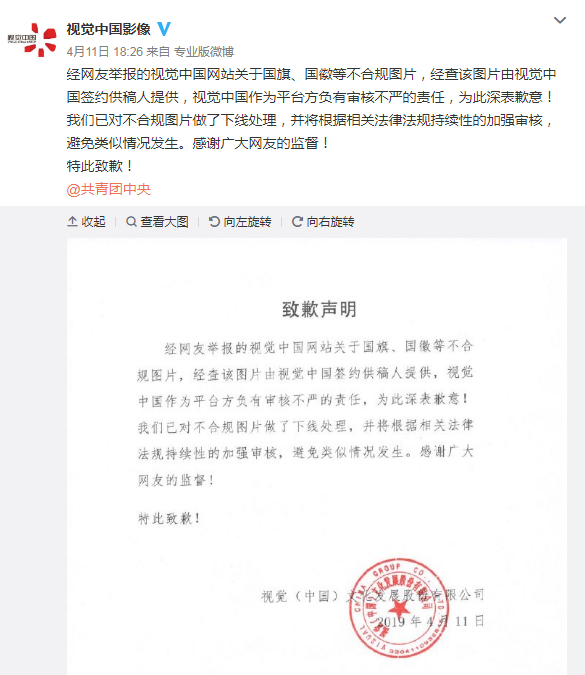 4月11日,視覺中國因黑洞照片版權問題引發(fā)公眾質疑,共青團中央官方微博更是直接質問“國旗、國徽版權也是貴公司的?”直指其版權不合理售賣問題。視覺中國官方微博當日回應,經網友舉報的視覺中國網站關于國旗、國徽等不合規(guī)圖片,經查該圖片由視覺中國簽約供稿人提供,視覺中國作為平臺方負有審核不嚴的責任,為此深表歉意!已對不合規(guī)圖片做了下線處理,并將根據相關法律法規(guī)持續(xù)性的加強審核,避免類似情況發(fā)生。