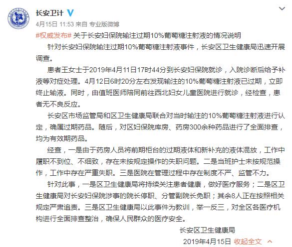人民網(wǎng)北京4月15日電 據(jù)西安市長安區(qū)衛(wèi)生和計劃生育局官網(wǎng)微博消息,針對長安婦保院輸注過期10%葡萄糖注射液事件,長安區(qū)衛(wèi)生健康局迅速開展調(diào)查。 患者王女士于2019年4月11日17時44分到長安婦保院就診,入院診斷后給予補液等對癥處理。4月12日6時20分左右發(fā)現(xiàn)輸注的10%葡萄糖注射液已過期,立即終止輸液。同時,由值班醫(yī)師陪同前往西北婦女兒童醫(yī)院進行就診,經(jīng)檢查,患者無不良反應(yīng)。 長安區(qū)市場監(jiān)管局和區(qū)衛(wèi)生健康局聯(lián)合對當時輸注的10%葡萄糖注射液進行認定,確屬過期藥品。隨后,對區(qū)婦保院庫房、藥房300余種藥品進行了全面排查,均為有效期藥品。 經(jīng)查,一是由于藥房人員將前期柜臺的過期液體和新補充的液體混放,工作中履職不到位、不細致,存在未按規(guī)定操作的失職問題。二是當班護士未按規(guī)范操作,工作中存在嚴重失職。三是醫(yī)院在管理過程中存在制度不嚴、監(jiān)管不力。 針對此事,一是區(qū)衛(wèi)生健康局將持續(xù)關(guān)注患者健康,做好醫(yī)療服務(wù);二是區(qū)衛(wèi)生健康局對長安婦保院涉事的院長停職、分管副院長免職;其余8人正在按照相關(guān)規(guī)定嚴肅追責。三是區(qū)衛(wèi)生健康局以此事件為教訓,舉一反三,對全區(qū)各醫(yī)療機構(gòu)進行全面排查整治,確保人民群眾的醫(yī)療安全。