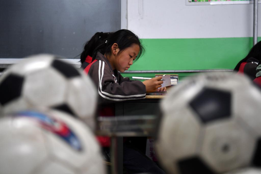 ↑這是學生們在做足球操(4月18日攝)。新華社記者詹彥攝