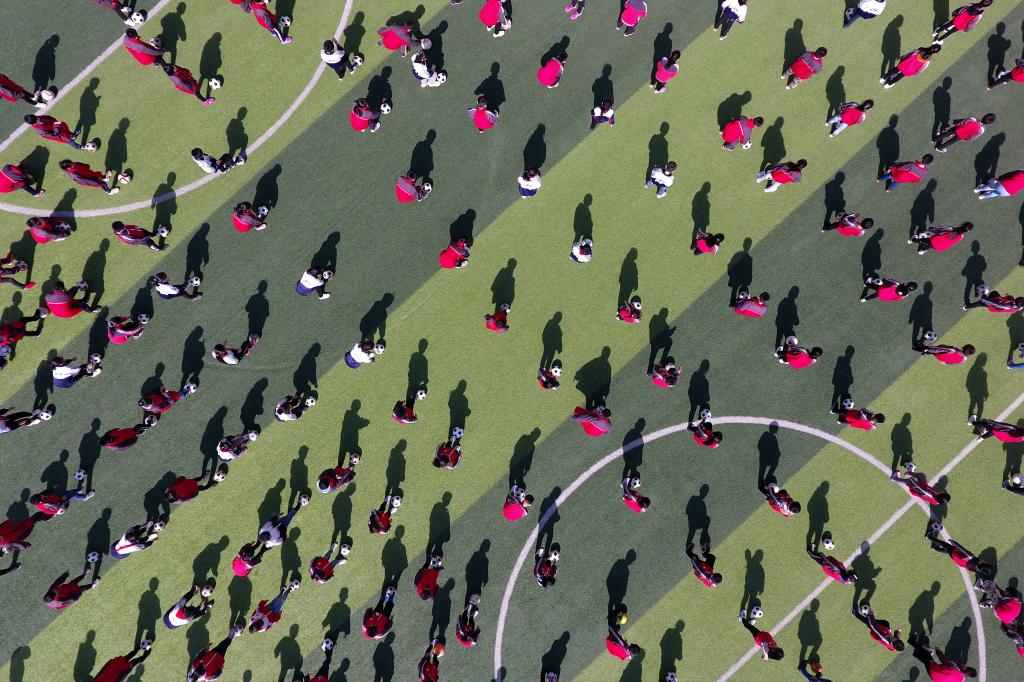 ↑這是學(xué)生們?cè)谇驁?chǎng)上訓(xùn)練(4月16日攝)。新華社記者詹彥攝