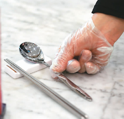 在北京市朝陽(yáng)大悅城一家餐飲店內(nèi),食客隔位而坐,餐具“公私”分明。“開(kāi)始使用公筷、公勺時(shí),有點(diǎn)不習(xí)慣,不過(guò)現(xiàn)在已經(jīng)適應(yīng)了,分著吃更安全?!痹诘陜?nèi)用餐的黃先生說(shuō)。