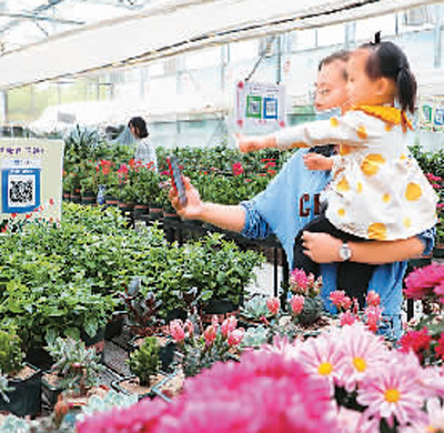 江蘇南通市民在五里樹(shù)花卉基地掃碼購(gòu)買(mǎi)鮮花,體驗(yàn)不接觸購(gòu)物帶來(lái)的便捷。王俊榮攝(人民視覺(jué))