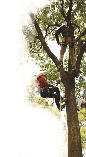 韓驚雷表示:“在攀樹前,會在樹枝上安裝上樹木保護器,樹木保護器實際上是一根兩頭帶著圓環(huán)的扁帶,寬2.5厘米,在攀樹過程中,它是唯一與樹木直接接觸的工具,可以避免繩索摩擦破壞樹木,以保護樹皮不受損,這樣的訓練,不僅不會破壞樹木的生長,反而會對樹木起刺激作用,促進樹木的生長?!?/p>