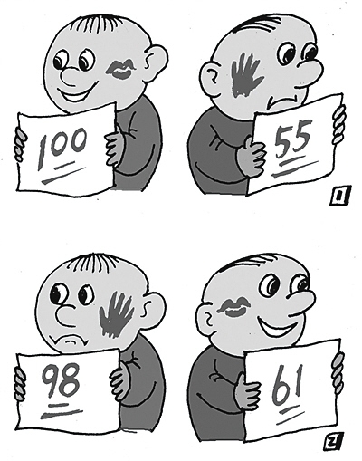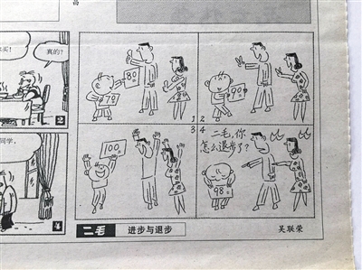 一個孩子考了100分,受到表揚(yáng)。后來考了98分,結(jié)果被打了耳光;另一孩子考了55分,被打了耳光。第二次考了61分,卻受到表揚(yáng):這幅名為《進(jìn)步與退步》的四格漫畫,入選為2016年高考全國卷1的作文題目。