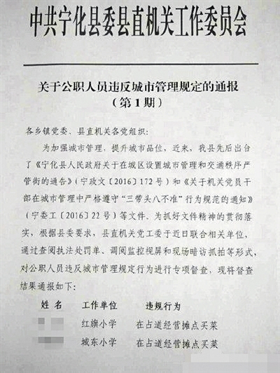 爭議由一份通報文件開始。網(wǎng)傳圖片顯示,一份抬頭為“中共寧化縣委縣直機(jī)關(guān)工作委員會”的《關(guān)于公職人員違反城市管理規(guī)定的通報》中,寧化縣針對公職人員違反城市管理規(guī)定行為進(jìn)行專項督查,并對部分公職人員進(jìn)行了公開通報。其中,文件第一頁列明,兩名工作單位分別為紅旗小學(xué)和城東小學(xué)的教師,因為“在占道經(jīng)營攤點買菜”的違規(guī)行為,受到通報處理。