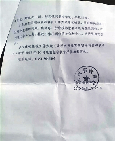 山西省教育廳基礎(chǔ)教育處一名工作人員向新京報(bào)記者確認(rèn),上述文件由省廳于2015年10月12日下發(fā),具有行政效力。