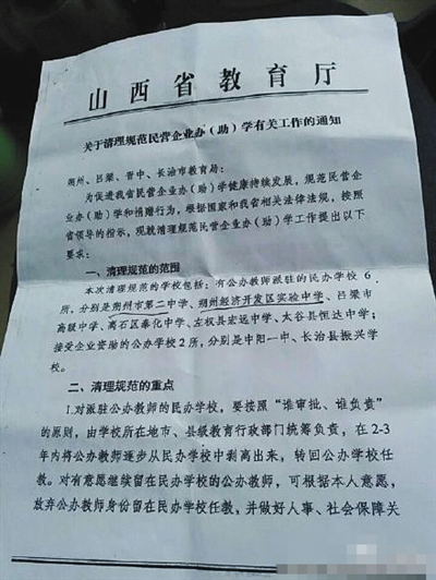 新京報(bào)記者看到,文件名為《關(guān)于清理規(guī)范民營(yíng)企業(yè)辦(助)學(xué)有關(guān)工作的通知》,加蓋有山西省教育廳公章。文件中明確提出,“在2-3年內(nèi)將公辦教師逐步從民辦學(xué)校中剝離岀來,轉(zhuǎn)回公辦學(xué)校任職?!?/p>