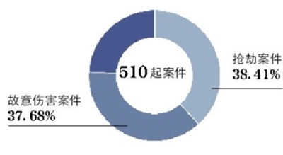 廣東省檢察機關2013年至2015年受理移送審查起訴校園暴力案件,510起案件中,搶劫、故意傷害案件分別占38.41%及37.68%