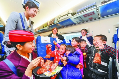 1月24日,在重慶開往福州的G1755次列車上,乘務(wù)員和“小候鳥”做游戲。春運(yùn)期間,大批務(wù)工人員子女隨長(zhǎng)輩踏上與父母團(tuán)聚的旅途,南鐵福州客運(yùn)段提前對(duì)重點(diǎn)線路乘務(wù)組進(jìn)行兒童陪護(hù)培訓(xùn),在列車上準(zhǔn)備了書本和玩具,用愛心護(hù)航“小候鳥”的團(tuán)圓路。新華社記者 宋為偉攝