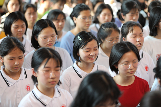 6月28日,湖南永州道縣第一中學學生在緊張準備高考的同時,參加心理講座,開展快樂減壓活動。視覺中國供圖