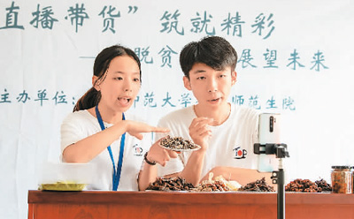 7月24日,在江西省吉安市新干縣潭丘鄉(xiāng)產(chǎn)業(yè)就業(yè)扶貧服務(wù)中心,江西師范大學(xué)暑期社會實踐大學(xué)生正在直播推銷當(dāng)?shù)剞r(nóng)家小吃醬餅,助力鄉(xiāng)村振興。李福孫攝(人民視覺)