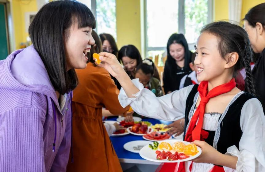 2023年5月12日,呼和浩特市玉泉區(qū)五塔寺東街小學(xué)學(xué)生請(qǐng)媽媽品嘗自己剛剛拼好的水果拼盤(pán)。通訊員 丁根厚 攝