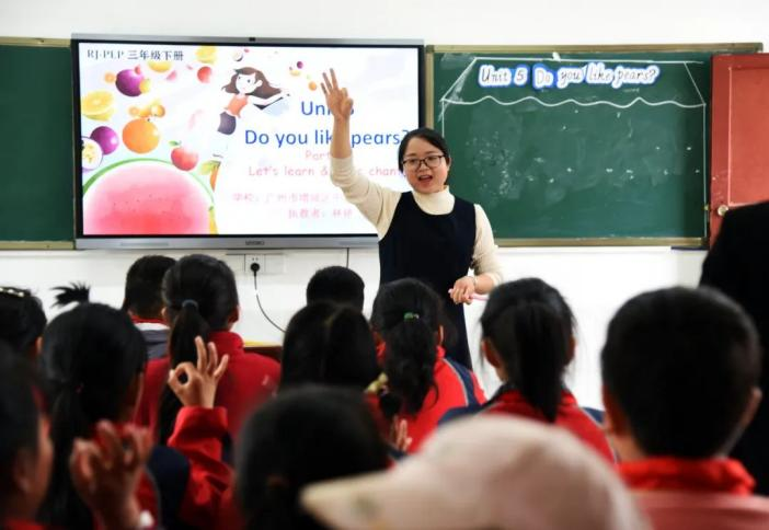 2023年4月13日,在貴州省黔西市鐵石苗族彝族鄉(xiāng)鐵石小學(xué),來(lái)自廣州市增城區(qū)中新鎮(zhèn)第二小學(xué)的老師在上英語(yǔ)公開(kāi)課。通訊員 熊軍萬(wàn) 攝