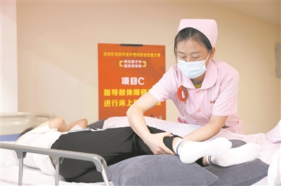 在安徽省合肥市瑤海區(qū)首屆養(yǎng)老護(hù)理員職業(yè)技能大賽現(xiàn)場(chǎng),選手參加護(hù)理技能比賽。新華社發(fā)(解琛攝)