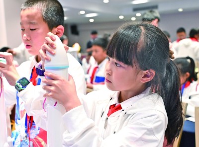 少先隊(duì)員走進(jìn)文昌航天發(fā)射場,參加制作水火箭等活動。新華社發(fā)
