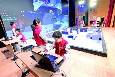 北京市海淀區(qū)實(shí)驗(yàn)小學(xué)的學(xué)生在操控機(jī)甲機(jī)器人進(jìn)行對抗比賽。新華社發(fā)