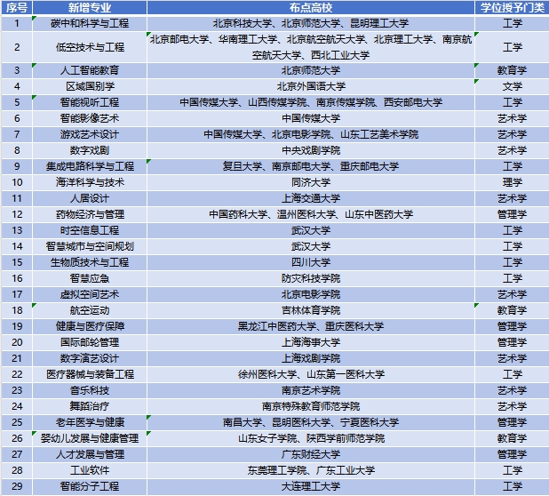 這也是近3年來新增本科專業(yè)較多的一次。記者梳理發(fā)現(xiàn),29種新專業(yè)涉及19個大類,其中交叉工程類、醫(yī)學技術(shù)類、戲劇與影視學類較多。